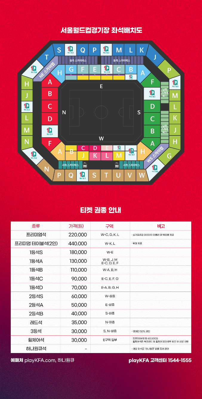 서울월드컵경기장 1등석은 5개 구역으로 나누어지며 구역에 따라 7만원에서 18만원입니다. 2등석은 3개 구역으로 나누어지며 4만원에서 6만원입니다. 3등석은 3만원이며 응원석인 레드석은 3만 5천원에 판매를 합니다. 휠체어석은 3만원이며 휠체어 동반자석은 6만원입니다.