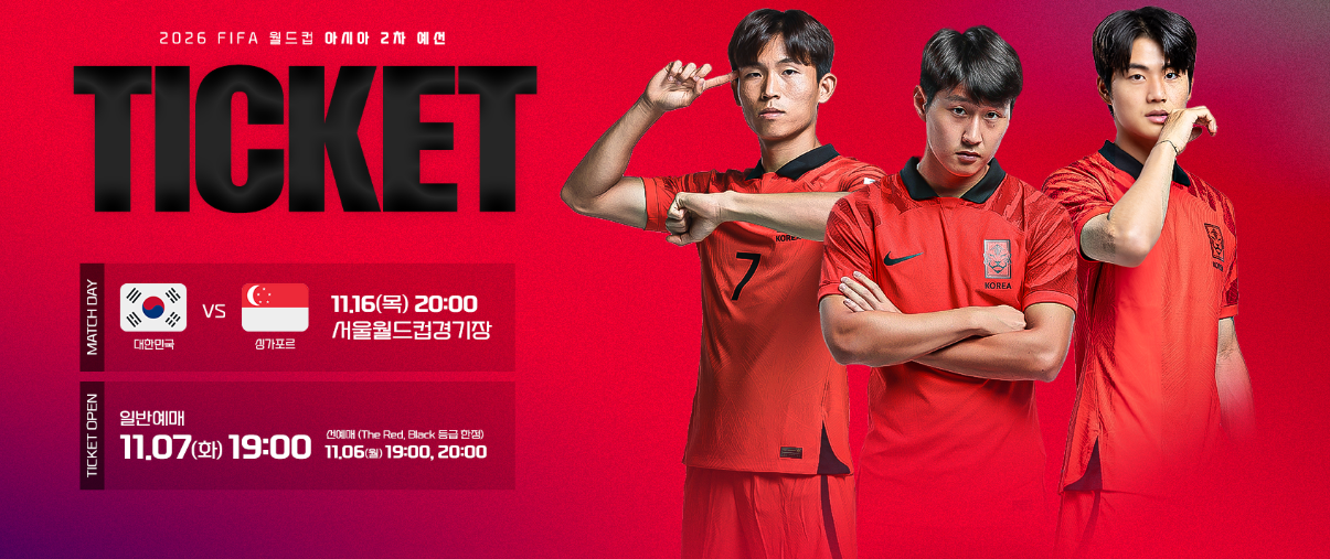 2026년 북중미 월드컵 아시아 2차 예선 싱가포르전 티켓판매를 합니다. 경기 당일에 2024년 대학수학능력시험이 열리기 때문에 수험생들을 위한 무료티켓 이벤트도 진행합니다. 이번 경기에 손흥민, 이강인, 김민재, 이재성, 황희찬 등 해외에서 활약하고 있는 선수들이 참여하는 만큼 직관을 원하는 분은 아래에서 바로 예매하시면 됩니다.